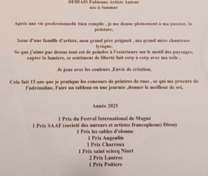 Pour cette 17ème édition, nous invitons Fabienne Debiais à présenter ses oeuvres. Fabienne a été parmi nos coups de coeur de l’an passé lors du concours 2025. L’exposition se tiendra à la salle de la Mairie pendant toute la durée du Festival les 22 et 23 Août 2026.